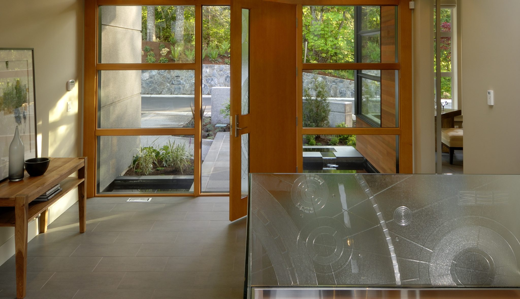 Chris was inspired to incorporate a Japanese influence in the exterior details for this modern home. Extensive use of native douglas fir brings an unmatched warmth to the interior, and the innovative front entry water feature creates a sense of serene seclusion on the populated street.