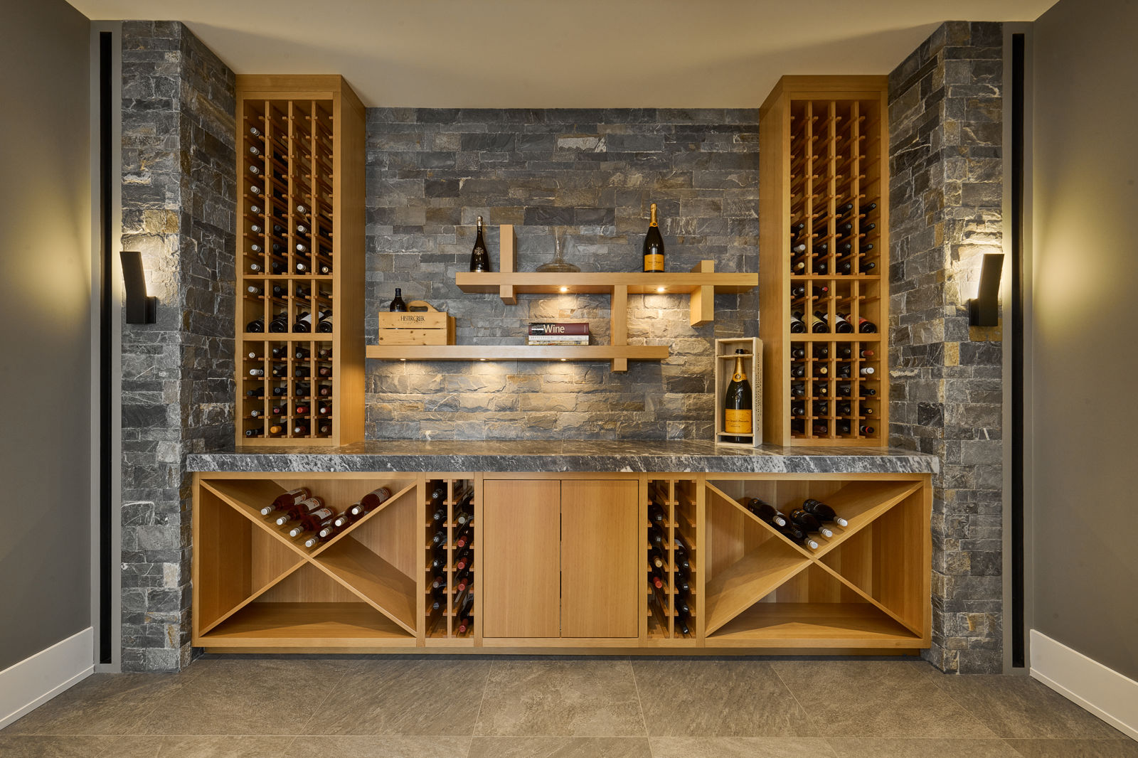 A large climate controlled wine room sits adjacent to the downstairs media room.