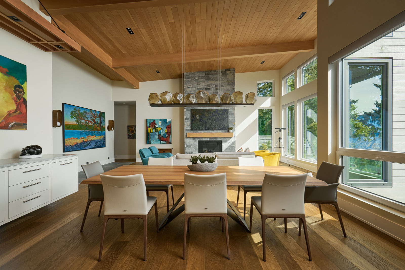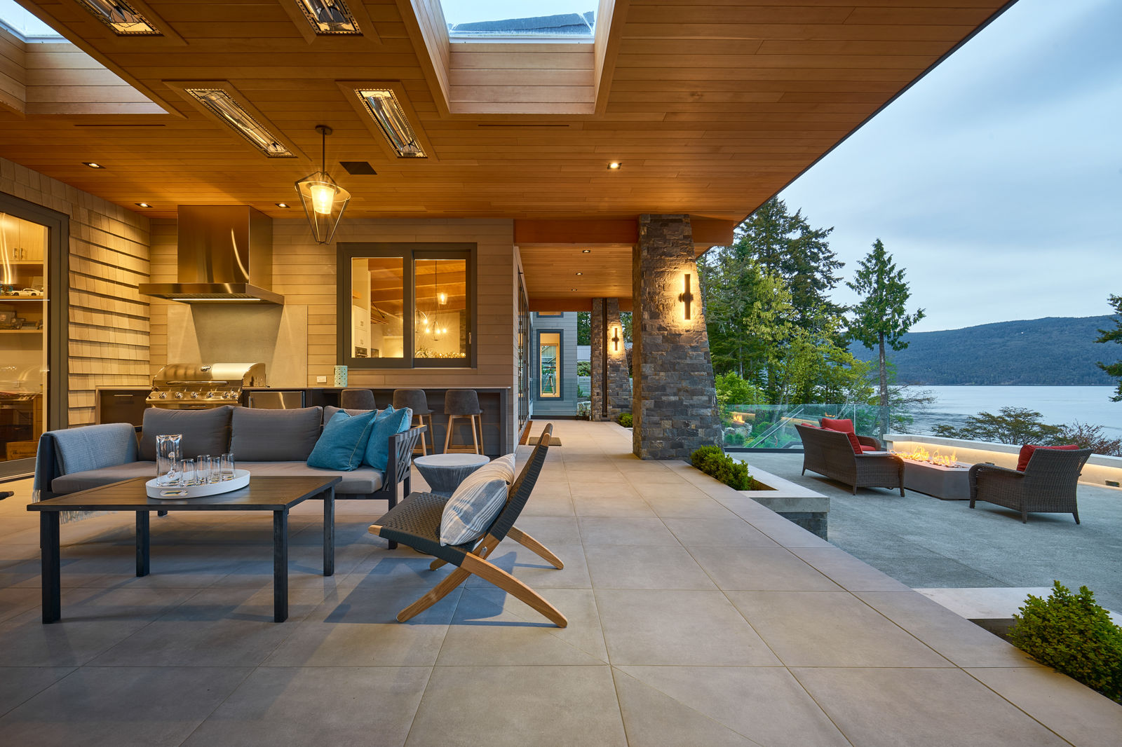 This West Coast modern waterfront home features exceptional craftsmanship at every turn. A graceful pitched roof-line with substantial wood beams inset into stone-clad tapered columns creates architectural appeal, and dramatic interior spaces.